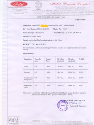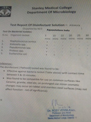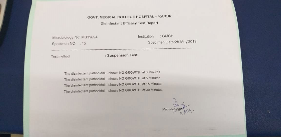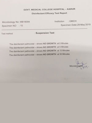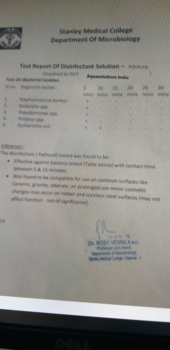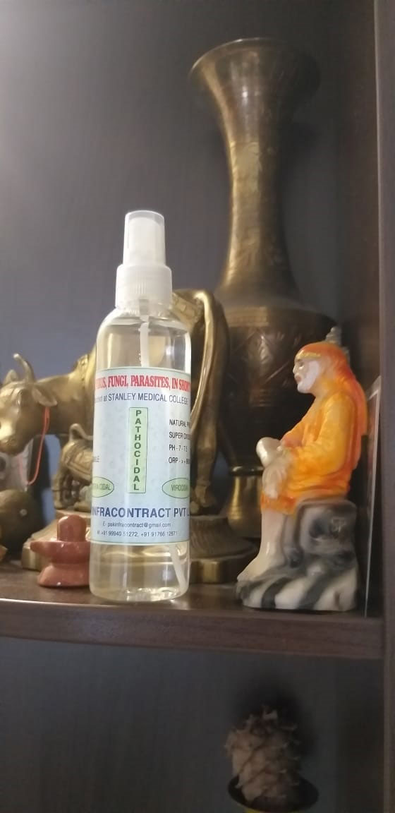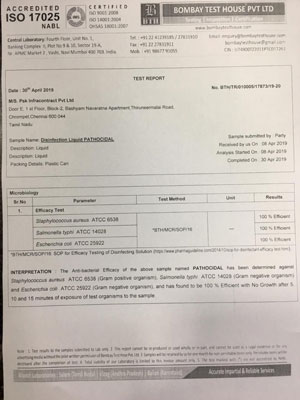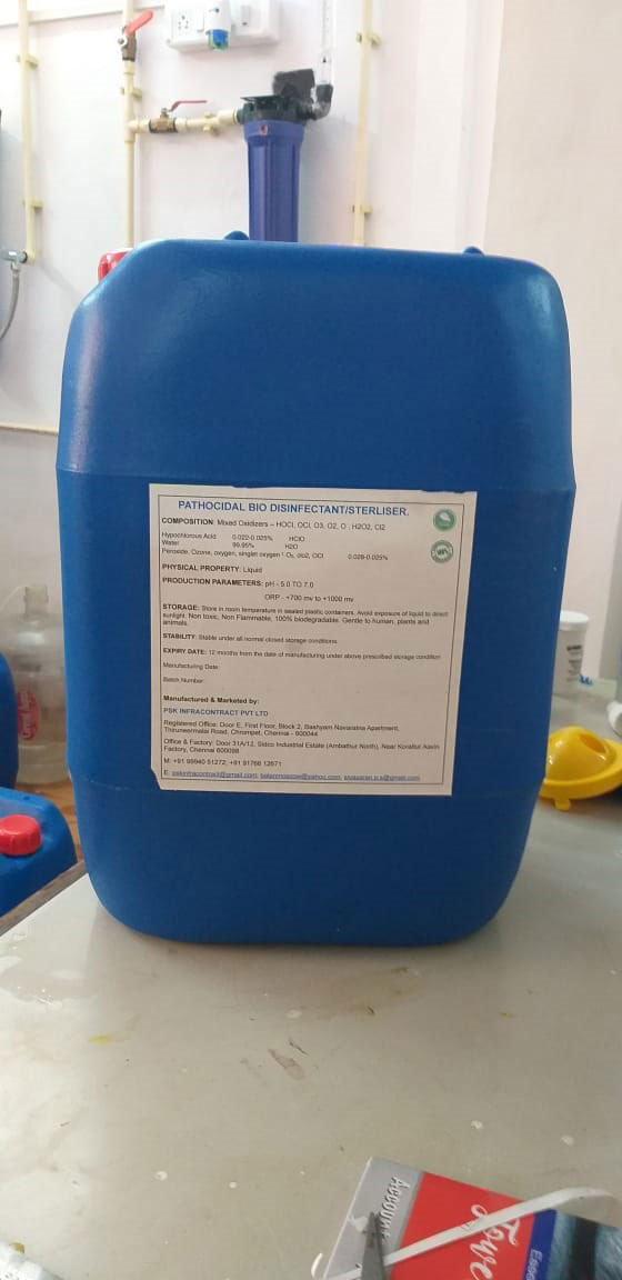 Pathocidal is a mixed-oxidant solution having ORP +700mv to +1000mv with major constituent Hypochlorous. It exhibits behavioural traits associated with a more active chlor-oxygen chemistry than traditional chlorine. In contrast to other disinfectant technologies, mixed oxidants Pathocidal offer superior disinfection efficacy against all known pathogens in world. It effectively eliminates biofilm in drinking water and other water bodies, It does not produce any byproducts. It is very mild to humans and animals, does not cause any sideffects when applied. It can be applied on any surfaces (like Stainless steel, rubber, wood etc..)