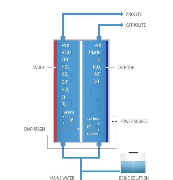 The anolyte has superior sterilizing and disinfectant properties, since the reactive species present in the solution are more effective in destroying microorganisms and organic molecules than chlorine alone. Organic molecules such as pesticides, tannins and phenols, which are of concern in terms of toxicity, color and off-flavors, are effectively oxidized.